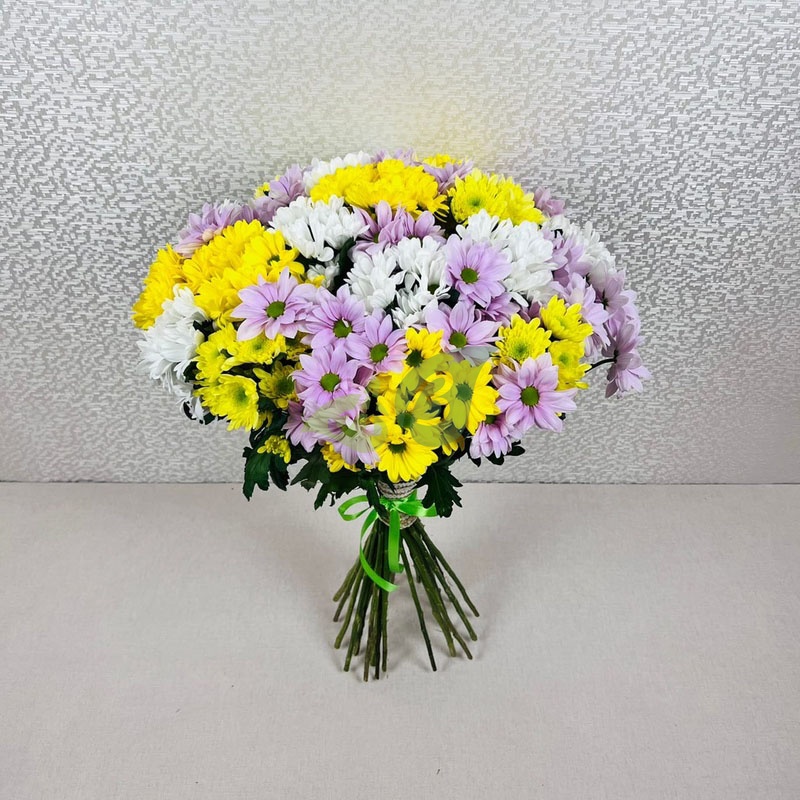 Закажите большой букет из сиреневых, белых, желтых и розовых хризантем.